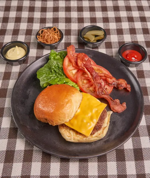 Pan brioche, mezcla de carnes, tocineta, queso cheddar, vegetales, pepinillos, cebollas locas y salsa de la casa acompañado de papas a la francesa»