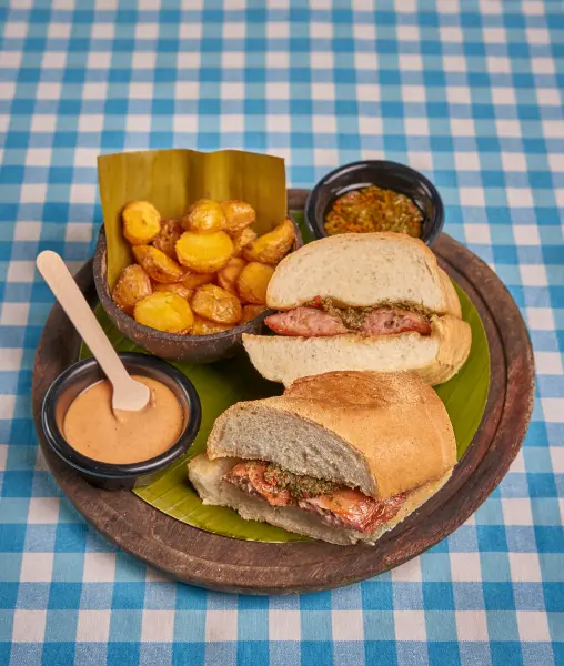 Clásico argentino, con pan de corteza, chorizo y chimichurri. Acompañado de papas criollas y mayonesa de morrones